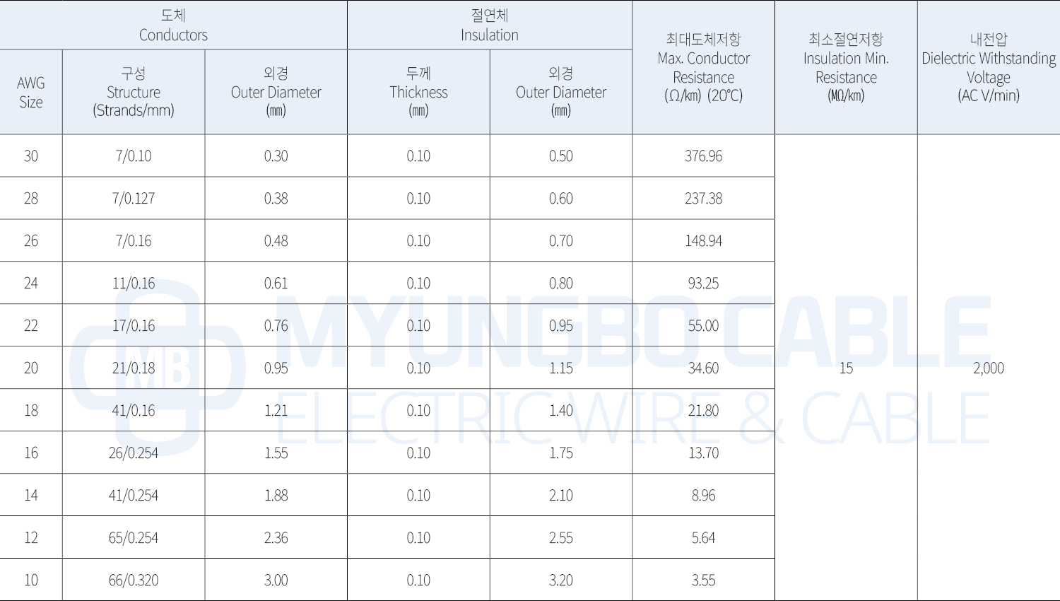 - 생산범위 (Available AWG): 36AWG - 10AWG