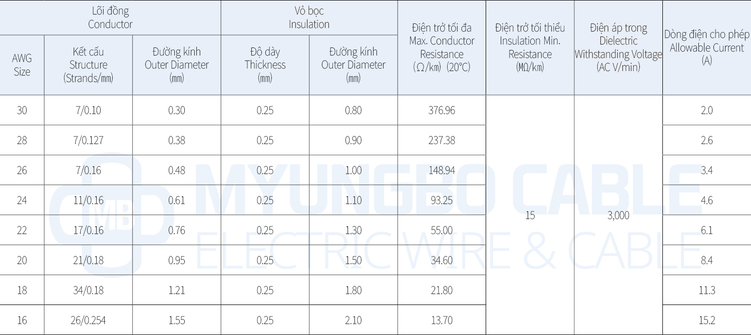 - Phạm vi sản xuất: 30AWG - 14AWG