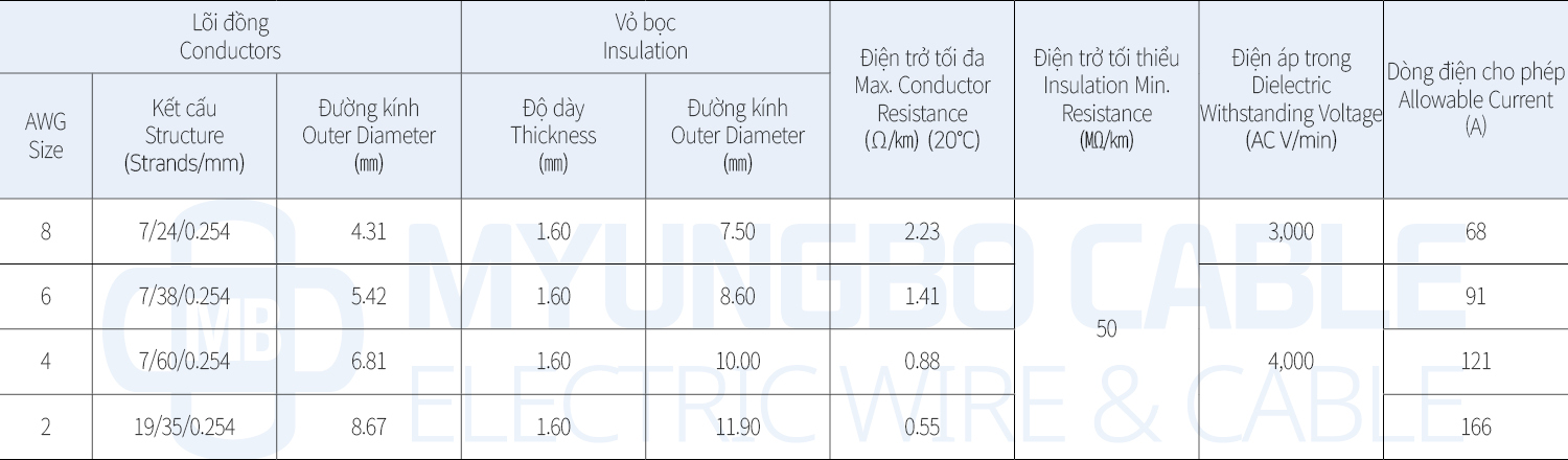 - Phạm vi sản xuất: 8AWG - 2AWG