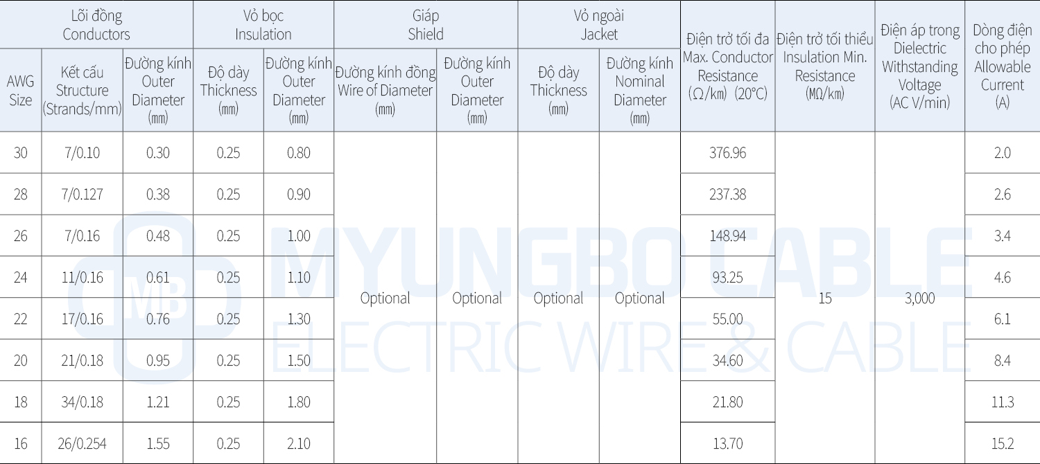 - Phạm vi sản xuất: 50AWG MIN
